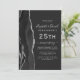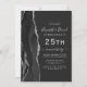 The left-hand edge of this elegant modern wedding anniversary party invitation features a black watercolor agate border trimmed with silver faux glitter. The customizable text combines silver gray handwriting, copperplate and italic fonts on a slate black background. The reverse side features a matching black and silver agate design.