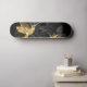 Schmuck aus schwarzem und goldenem Schmuck, der mit grauem Hintergrund und Pflanze geschmückt ist. Schmuckvögel. Goldener Vogel. Goldvogel.