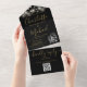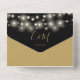 Alle in einer Hochzeitseinladung mit hübschen Saitenlichtern, Mauerkrümeln, Signaturstil-Namen und schicken Goldtypografie auf schwarzem Hintergrund. Die Einladung enthält eine perforierte RSVP-Karte mit QR-Code. Entwickelt von Thisisnotme©