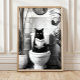Black and White Bathroom Cat Print, Funny Posters, Poster