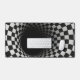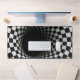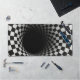 A tunnel-like optical illusion is created using a black and white checkered pattern, giving a dizzying sense of depth