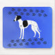 Black and white Whippet dog image with paw prints on a blue sky background.
