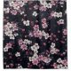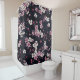 This is a shower curtain with a black background with some white and pink little flowers.