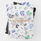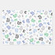 Papierblätter zum Geburtstag mit passenden Mustern in verschiedenen Blau-, Grün- und Schwarztönen. Ein Blatt zeigt das Alter des Geburtstagsjungen in einem lustigen Muster. Ein Blatt hat weiße Sterne auf schwarz. Ein Muster hat weiße und blaue Streifen.