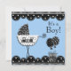 Adorable train noir et bleu et bébé chariot invitation à la douche bébé garçon. Ajoutez vos détails à l'avant et/ou à l'arrière en cliquant simplement sur le bouton "Customisez-le !" pour commencer à ajouter les détails de votre événement, le style de police, la taille et la couleur de la police et le libellé. Veuillez noter que tous les modèles d'invitation que vous trouverez sur Zazzle sont des graphiques imprimés sans bijoux, arcs, surélevés, gaufrés, ou des pièces ou pièces ajoutées.