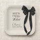 Party paper plates designed with a classic black bow motif and the phrase shes tying the knot. Created for a clean, elegant table setting that pairs well with black and white wedding decor. Suitable for bridal showers, engagement parties, bachelorette gatherings, and wedding celebrations. Fully customizable text with a print-ready design for party tableware.