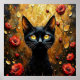 A cute black cat with large yellow eyes and red roses on a gold and brown mott;ed background