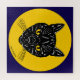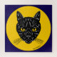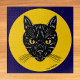 A retro-looking illustration of the face of a yellow-eyed black cat appears in a moon-like circle in this original Halloween-appropriate art by Richard H. Fay.