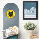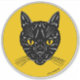 A retro-looking illustration of the face of a yellow-eyed black cat appears in a moon-like circle in this original Halloween-appropriate art by Richard H. Fay.