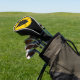 A retro-looking illustration of the face of a yellow-eyed black cat appears in a moon-like circle in this original Halloween-appropriate art by Richard H. Fay.