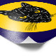 A retro-looking illustration of the face of a yellow-eyed black cat appears in a moon-like circle in this original Halloween-appropriate art by Richard H. Fay.