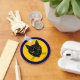 Eine rückwirkende Abbildung des Gesichts einer gelb-mit Augen schwarzen Katze erscheint in einem mondähnlichen Kreis in dieser originalen Halloween-angemessenen Kunst von Richard H. Fay.