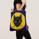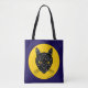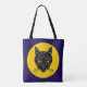 Eine rückwirkende Abbildung des Gesichts einer gelb-mit Augen schwarzen Katze erscheint in einem mondähnlichen Kreis in dieser originalen Halloween-angemessenen Kunst von Richard H. Fay.
