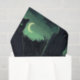 Eine schwarze, glänzende Katze mit leuchtenden grünen Augen, die auf einem Zaunpfosten sitzt und im Hintergrund einen Halbmond hat