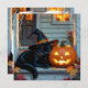 Eine niedliche Halloween-Karte, auf der Sie die Nachricht personalisieren können. Eine niedliche Illustration einer schwarzen Katze, die auf der vorderen Veranda mit einem Hexenhut auf klopft, neben einer Jack-o-Laterne zu Halloween gewartet, um sie zu betrügen oder zu pflegen.