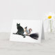 Eine schwarze Katze und ein Hexeneichhörnchen reiten auf dieser Halloween-Karte einen Besenstiel.