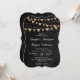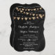 Schwarze Chalkboard Hochzeitseinladung mit Burlap Bunt auf einem schwarzen Chalkboard Hintergrund mit Saitenleuchten verziert.