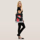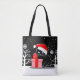 Im Weihnachtsdesign findet man eine schwarze Katze, die mit einer roten Weihnachtsmannmütze geschmückt ist und neben einem rot-weiß verpackten Weihnachtsgeschenk auf einem schwarz-weißen Winterwunderland mit Bäumen und Schnee sitzt.