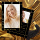 Moderne Goldfolie und schwarze Klasse von 2025 mit Foto Abschluss Ankündigung. Dieses Foto Announcement wurde mit einer eleganten und zeitgenössischen Touch entworfen. Die Kombination aus schwarzer und goldener Folie schafft eine moderne Ästhetik, wobei der goldene Rahmen das Foto des Absolventen elegant vor einem schwarzen Hintergrund umrahmt. Der Name und andere wichtige Informationen werden sorgfältig außerhalb des Rahmens platziert, sodass sie mit ihrer goldenen Farbe auf dem schwarzen Hintergrund auffallen. Auf der Rückseite der Ankündigung finden Sie die gleiche stilvolle Grenze mit einem anderen Foto und alle wesentlichen Details über den Abschluss. Die Abdeckung wurde unter Verwendung einiger Elemente von Freepik.com entworfen