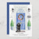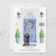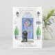 Annoncez votre nouvelle adresse avec notre faire-part élégante avec un Cockapo noir, porte d'entrée bleue, tapis de bienvenue, ardoise, topiaires et une couronne fleurie posée sur un arrière - plan en brique grise.