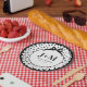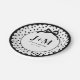 this design features a black and white polka dot pattern surrounded by a black ribbon frame. You can personalize with initials, names and a year.