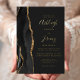Die links Seite dieses eleganten, modernen Hochzeitseinladens besticht durch einen schwarzen Aquarellrahmen, der mit vergoldetem Imitat bestickt ist. Der anpassbare Text kombiniert Handschrift, Copperplate und kursiv Schriftart in realer Goldfolie auf schwarzem Hintergrund. Auf der Rückseite ist ein passendes schwarz-goldfarbenes Agerat-Design zu sehen.