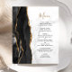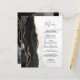 Die links Seite dieses eleganten, modernen Hochzeitsmenüs besticht durch einen schwarzen Aquarellrahmen, der mit vergoldetem Imitat-Glitzer besticht. Der anpassbare Text kombiniert goldfarbenes Handschriftenskript mit schwarzem Kopperplate-Schriftart auf weißem und grauem Marmorhintergrund. Auf der Rückseite ist ein passendes schwarz-goldfarbenes Agerat-Design zu sehen.