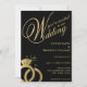 Elegante Schwarz-Gold Hochzeitseinladung mit glänzenden Diamantenringen. Personalisieren Sie es mit Ihren Veranstaltungsdetails.