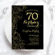 Black Gold Floral 70th Birthday Party Invitation. Design moderne minimaliste avec accents de dessin botanique, fausse feuille d'or et police de script de typographie. Carte invitation simple et tendance, parfaite pour une célébration anniversaire élégante. Peut être customisé à n'importe quel âge. Invitations Zazzle imprimées ou téléchargement instantané modèle imprimable numérique.