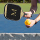 Schwarz und Gold Elegant Mit Monogramm Personalisiertes, kundenspezifisches Pickleball Paddel mit Ihrem Namen und großen Initial in schicken klassischen Schriftart. Ändern Sie Schriftart und Hintergrundfarbe mit dem Vorlageneditor von Zazzle.