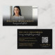 Berufliches Foto QR Code Unternehmen Horizontale Visitenkarte. Diese elegante und einfache Visitenkarte eignet sich ideal für Firmenmarken, kleine Unternehmen, Berater, Freiberufler oder alle beruflichen, die eine moderne, elegante Ästhetik suchen. Die Vorderseite zeigt Foto, Namen, Titel oder Firmennamen über einen schwarzen Farbverlauf am unteren Ende, mit gold-weißen Schriftart für einen eleganten Kontrast. Auf der Rückseite ist ein solider schwarzer Hintergrund mit goldfarbenen und weißen Schriftart und Details hervorgehoben, mit Ihren Kontaktinformationen über den verlassen und den QR-Code und optionalen Social Media Icons unten rechts. Typografie ist eine raffinierte Mischung aus handgeschriebener Skriptkalligraphie und einem klassischen SerifenSchriftart, die dem Design ein berufliches und dennoch stilvolles Aussehen verleiht. Vollständig anpassbar, können Sie Schriftart, Farben und Layout anpassen, um Ihre Marke Anzug.