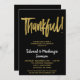 Une simple mais frappante invitation de fête de Thanksgiving noir et or. Texte du script Glam en haut avec le texte or ci-dessous et le nom de l'hébergement en blanc