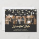 Elegantes personalisiertes Schwarz-Gold-Hochzeitskartentchen-Foto speichern Sie die Datumskarten mit einem modernen Script-Schriftart. Unsere Hochzeit speichern das Datum enthält eine Foto-Collage von 4 Bildern auf einem schwarzen Hintergrund mit Lichtern der Saiten. Auf Wunsch personalisieren Sie diese Schwarz-Gold-Save the Date-Karte mit Ihren Fotos und Hochzeitsdetails inklusive einer Hochzeitswebsite. Für individuelle Anfragen senden Sie uns bitte eine Nachricht.