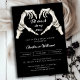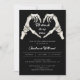 Schwarz-Gotische Liebe Halloween Bridal Dusche Einladung. Minimalistische Halloween-Brautdusche mit handgemalten Wasserfarben-Handskeletten in Herzform, Kalligraphie-Schrift und schlichtes, sauberes Design. Schwarzer Hintergrund vorne und hinten. Sie können die Formulierung, den Stil, die Farbe und die Größe des Schriftartes vor und hinter der Einladung personalisieren.