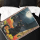 Eine schwarze Katze sitzt vor der Tür mit Kürbis, Laterne, Broomstick, Herbstblättern und einem Vollerntemond dahinter.