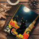 Eine schwarze Katze sitzt vor der Tür mit Kürbis, Laterne, Broomstick, Herbstblättern und einem Vollerntemond dahinter.