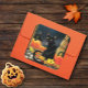 Eine schwarze Katze sitzt vor der Tür mit Kürbis, Laterne, Broomstick, Herbstblättern und einem Vollerntemond dahinter.