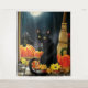 Eine schwarze Katze sitzt vor der Tür mit Kürbis, Laterne, Broomstick, Herbstblättern und einem Vollerntemond dahinter.
