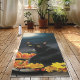 Eine schwarze Katze sitzt vor der Tür mit Kürbis, Laterne, Broomstick, Herbstblättern und einem Vollerntemond dahinter.