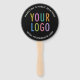 Easily personalize this black hand held fan with your own company logo and custom text. Custom printed hand held fans are handy promotional items for outdoor events or other hot weather occasions. 5.75 inch diameter. Available in black and other colors. Low minimum order quantity and no setup fee.