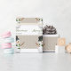 Desteis Cartoon illustriert einen niedlich lächelnden Schneemann. Der Schneemann trägt einen schwarzen Hut und einen Schal mit grünen und weißen Streifen. Die Hintergrundfarbe ist beige mit einem Muster weißer Punkte. Unter dem Bild steht "Frohe Weihnachten!" in grüner Farbe. Es gibt auch einen personalisierbaren Textbereich, in dem Sie entweder schreiben können, wem das Geschenk zusteht oder von wem es stammt.