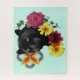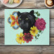 Ein Schwarz Jaguar Katzenportrait mit bunten mexikanischen Fliesen und Blume.