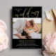 Einfache und schöne doppelseitige Einladung in einem Foto Hochzeit mit Ihren Fotos. Join uns für die Hochzeit von ist an der Spitze des Fotos Hochzeit einladen geschrieben, mit Hochzeit in einem schönen Kalligraphie-Skript in Goldfolie gedruckt. Ihre Namen auch in Goldfolie. Auf der anderen Seite fügen Sie ein weiteres Foto und zusätzliche Hochzeitsinformationen, die Ihre Gäste benötigen werden. Schwarz-Gold Foto Hochzeitseinladung.