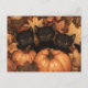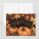 Aquarellbild eines schwarzen Kätzchentrios mit einem Hintergrund von Herbstblättern und Kürbissen.