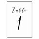 Elegante Tischnummer 1 Karte für Hochzeiten. Die Hochzeitskarte ist mit einem schönen schwarzen minimalistischen Skript ausgestattet. Weitere Nummern sind verfügbar. Entworfen für Sie von BlackBerry Boulevard.