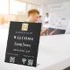 Ein schwarzer Hintergrund. Personalisieren Sie Ihren Firmennamen, Ihr Firmenlogo, Text, Ihre Zimmernummer und fügen Sie diese hinzu. QR-Code für Ihre Website, Veranstaltungsprogramm etc. Weißer Text.