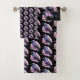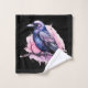 Handtuch Set mit einem sich wiederholenden Bild einer schwarzen Krähe mit lila rosa Flügeln. Ein rosa Aquarell-Spritzer hinter diesem mystischen Vogel.