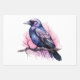 Papierblätter mit einem Bild einer schwarzen Krähe mit lila rosa Flügeln umhüllen. Ein rosa Aquarell-Spritzer hinter diesem mystischen Vogel.