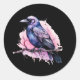 Aufkleber mit einem Bild einer schwarzen Krähe mit lila rosa Flügeln. Ein rosa Aquarell-Spritzer hinter diesem mystischen Vogel.