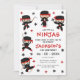 Feiern Sie den fröhlichen Moment Ihres kleinen Jungs Ninja Karate Geburtstag mit einer bezaubernden Einladung. Dieses reizvolle Design mit niedlichen Ninjas mit schwarzen und roten Shurikens.